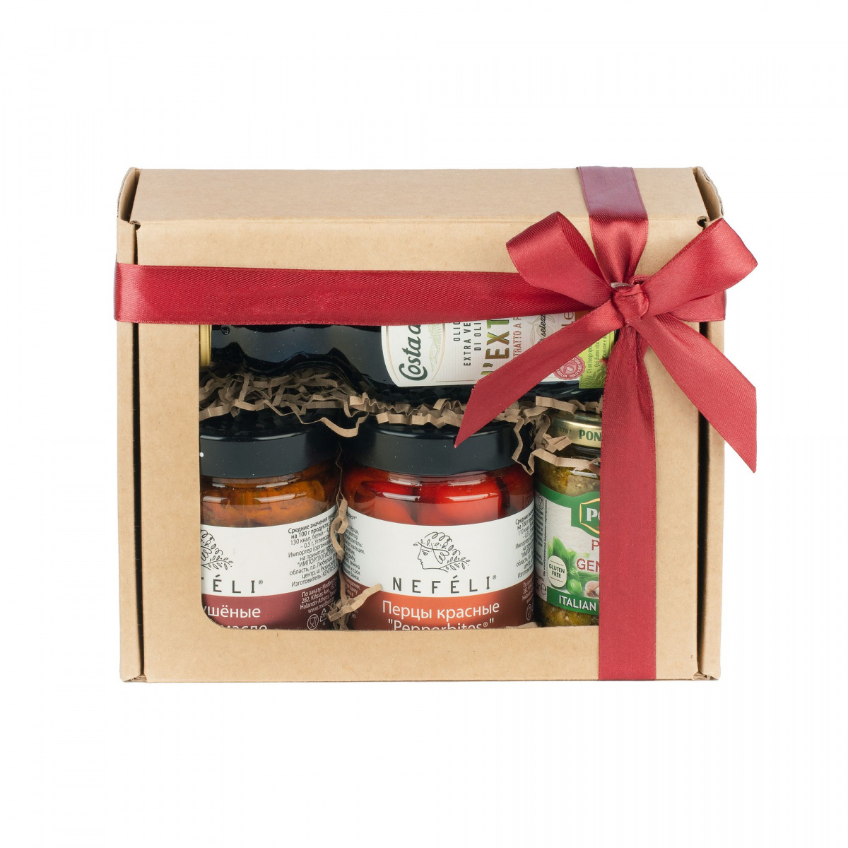 Изысканный гастрономический набор в стильной крафтовой коробке с атласной лентой станет отличным подарком для ценителей средиземноморской кухни. Внутри собраны продукты высокого качества, которые подчеркнут вкус любимых блюд и подарят новые гастрономические впечатления.