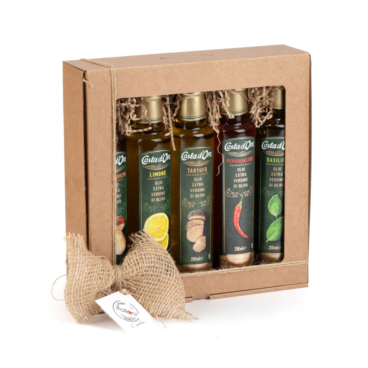 Элегантный набор ароматизированных оливковых масел Extra Virgin от Costa d’Oro — идеальный подарок для ценителей изысканных вкусов. В стильной крафт-коробке собраны масла с уникальными вкусами и ароматами, которые превращают любое блюдо в кулинарный шедевр.