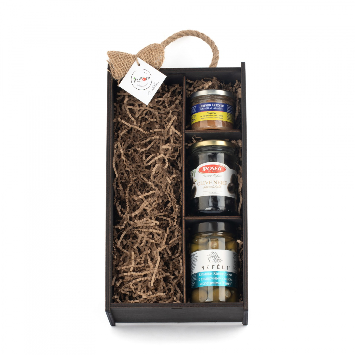 Идеальное сочетание деликатесов для стильного аперитива, сырной тарелки или неспешного гастрономического вечера. Продукты с выразительным вкусом и текстурой, вдохновлённые средиземноморскими и французскими традициями. Упакован в элегантный подарочный пенал с крафтовым наполнителем — всё готово к красивому вручению.