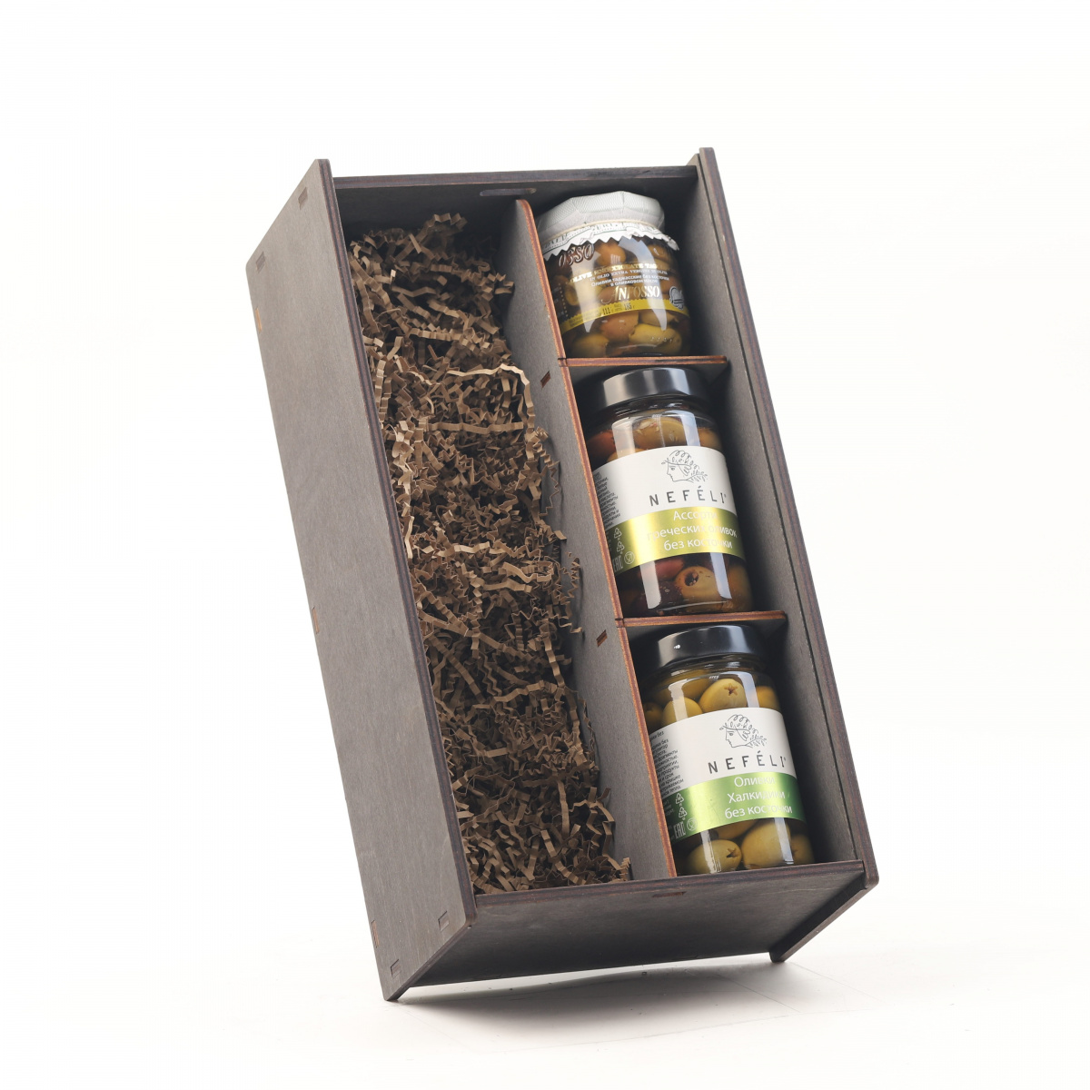 Утончённый набор, созданный для поклонников средиземноморской кухни и натуральных вкусов. Три вида отборных оливок — из Италии и Греции — идеально дополнят аперитив, сырную тарелку, пикник или праздничный стол. Всё оформлено в подарочный пенал с крафтовым наполнителем — эстетично, удобно и готово к вручению.