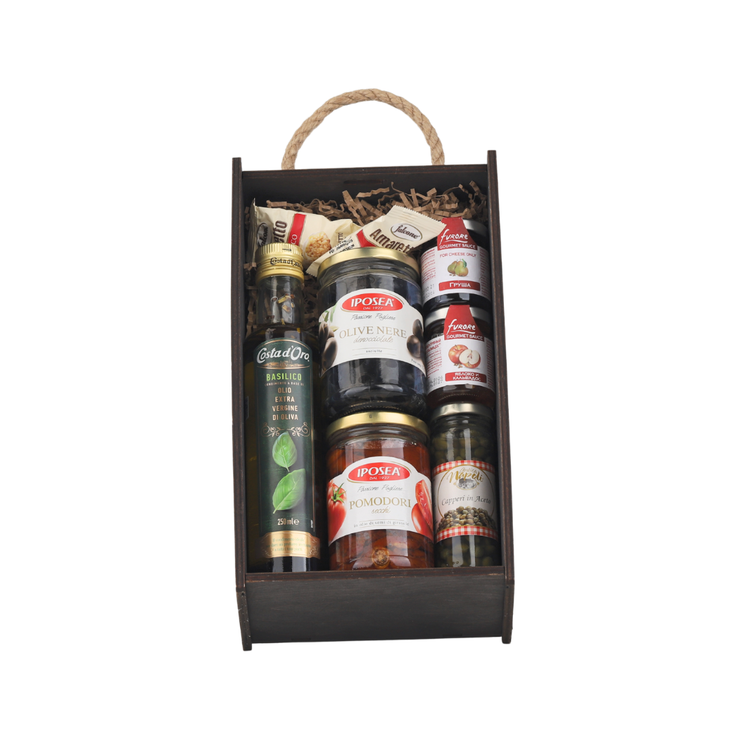 Масло оливковое Extra Virgin с базиликом, Costa d’Oro (0,250л), Томаты сушеные в масле, IPOSEA (0,280кг), Маслины без косточки, без жидкости, IPOSEA (0,125кг), Каперсы с уксусом, Antica Napoli (0,110кг), Соус фруктово-пряный гурмэ яблоко и кальвадос, Furore (0,060кг), Печенье сдобное Амаретти мягкие и классические, Falcone (10гр*100шт) (1кг)