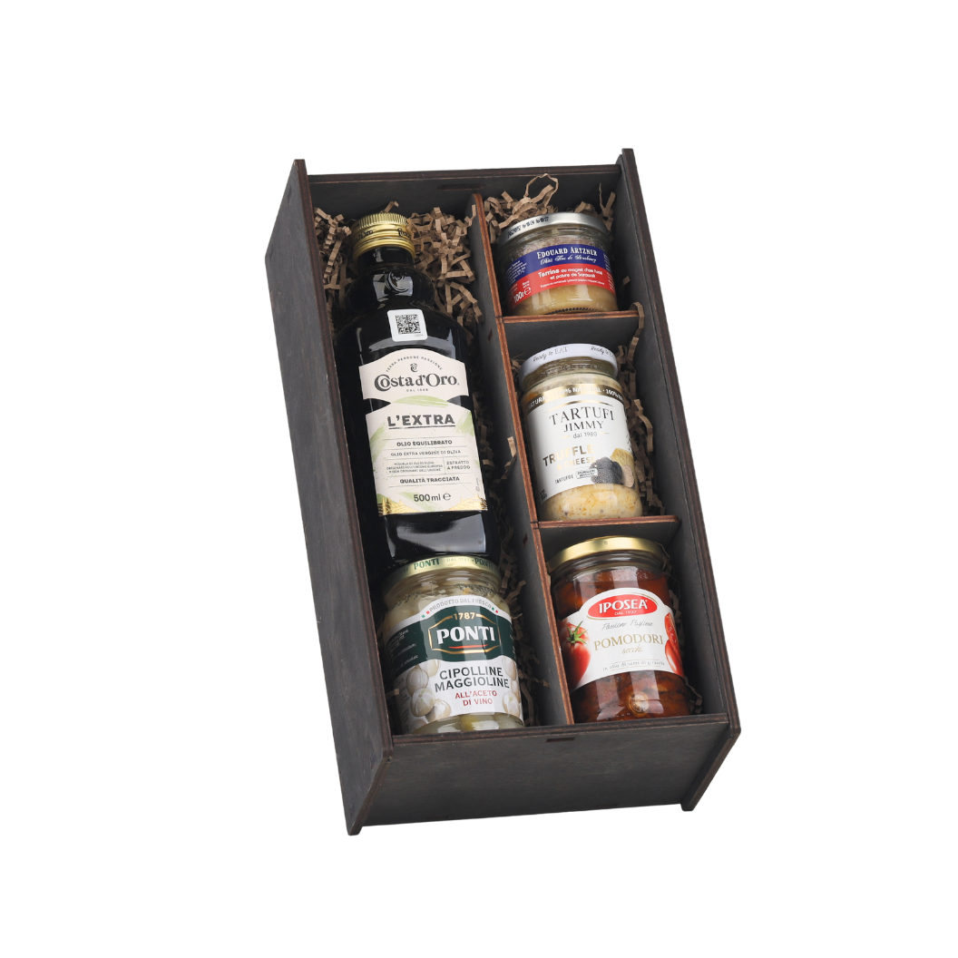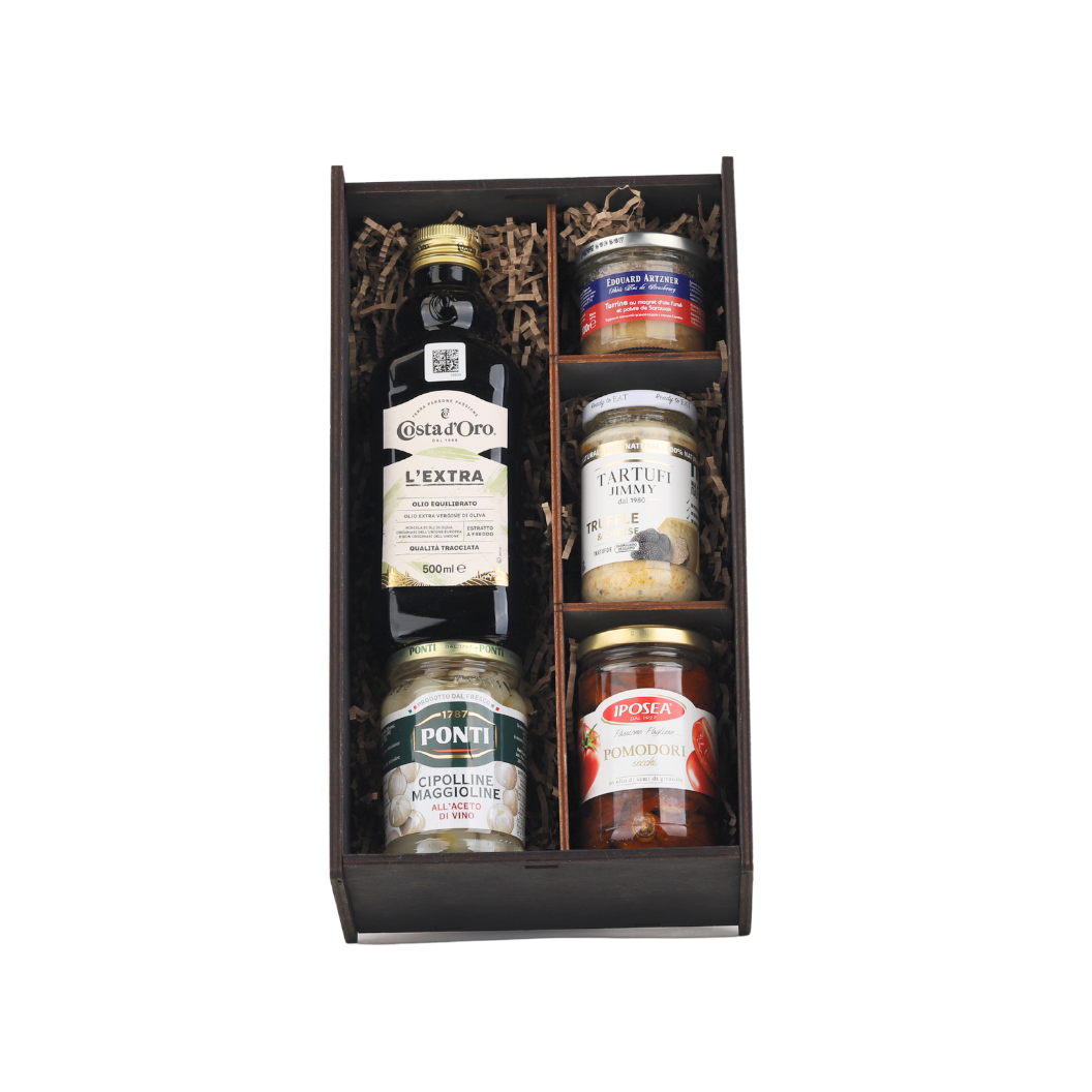 Премиальный гастрономический набор для истинных ценителей изысканных вкусов. Французский террин, итальянское оливковое масло, пикантные овощные закуски и редкий трюфельный соус — всё, что нужно для утончённой дегустации и красивой сервировки стола. Стильный деревянный пенал с крафтовым наполнителем и атласной лентой делает набор эффектным и готовым для подарка.