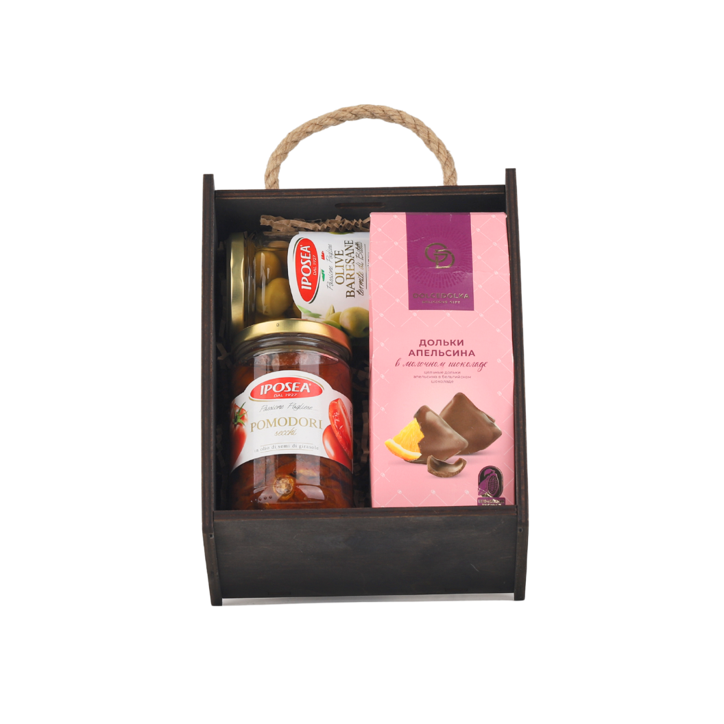 Элегантный и компактный набор, в котором гармонично сочетаются изысканные деликатесы Италии и сладкий десерт. Такой подарок порадует ценителей гастрономических открытий: солёное и пикантное, ароматное и сладкое — всё в одном стильном деревянном пенале. Упакован с крафтовым наполнителем и атласной лентой, он станет готовым решением для подарка коллегам, друзьям или близким.