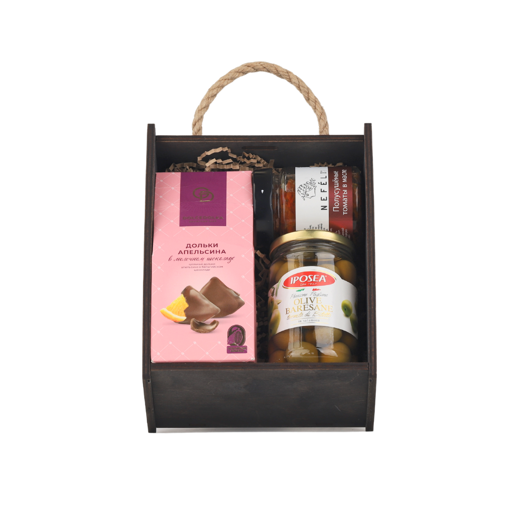 Стильный и вкусный подарок для тех, кто ценит гармонию натуральных вкусов. В наборе собраны оливки и томаты в лучших средиземноморских традициях, дополненные изысканным десертом — дольками апельсина в шоколаде. Всё оформлено в деревянный подарочный пенал с крафтовым наполнителем и лентой — готовое решение для презента коллегам, друзьям или близким.