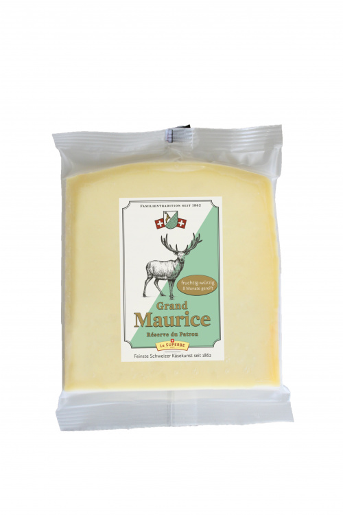 Сыр Grand Maurice Réserve du Patron (Гранд Морис) - это сыр созданный для особых случаев будь то праздник, посиделки с лучшими друзьями или встреча дорогих гостей. Основатель Lustenberger & Dürst Морис Лустенбергер охранял рецептуру этого сыра как настоящую жемчужину. Сыр Гранд Морис обладает благородным, сбалансированным, фруктовым вкусом, он будоражит вкусовые рецепторы, как никакой другой сыр. Созданный страстным сырым мастером Морисом Люстенбергером, рецепт для сыра Гранд Морис передавался в семья от поколения к поколению. И сейчас, производство этого великолепного сыра со столь охраняемым рецептом возобновляется, а сыр представляется как новинка. Сыр Гранд Морис производится по традиционному семейному рецепту с использованием свежего молока в одной из местных деревенских сыроварен. Сыр ручной работы созревает традиционным способом в течение 8 месяцев под пристальным наблюдением мастеров-сыроделов и приобретает уникальный, фруктовый и острый вкус.