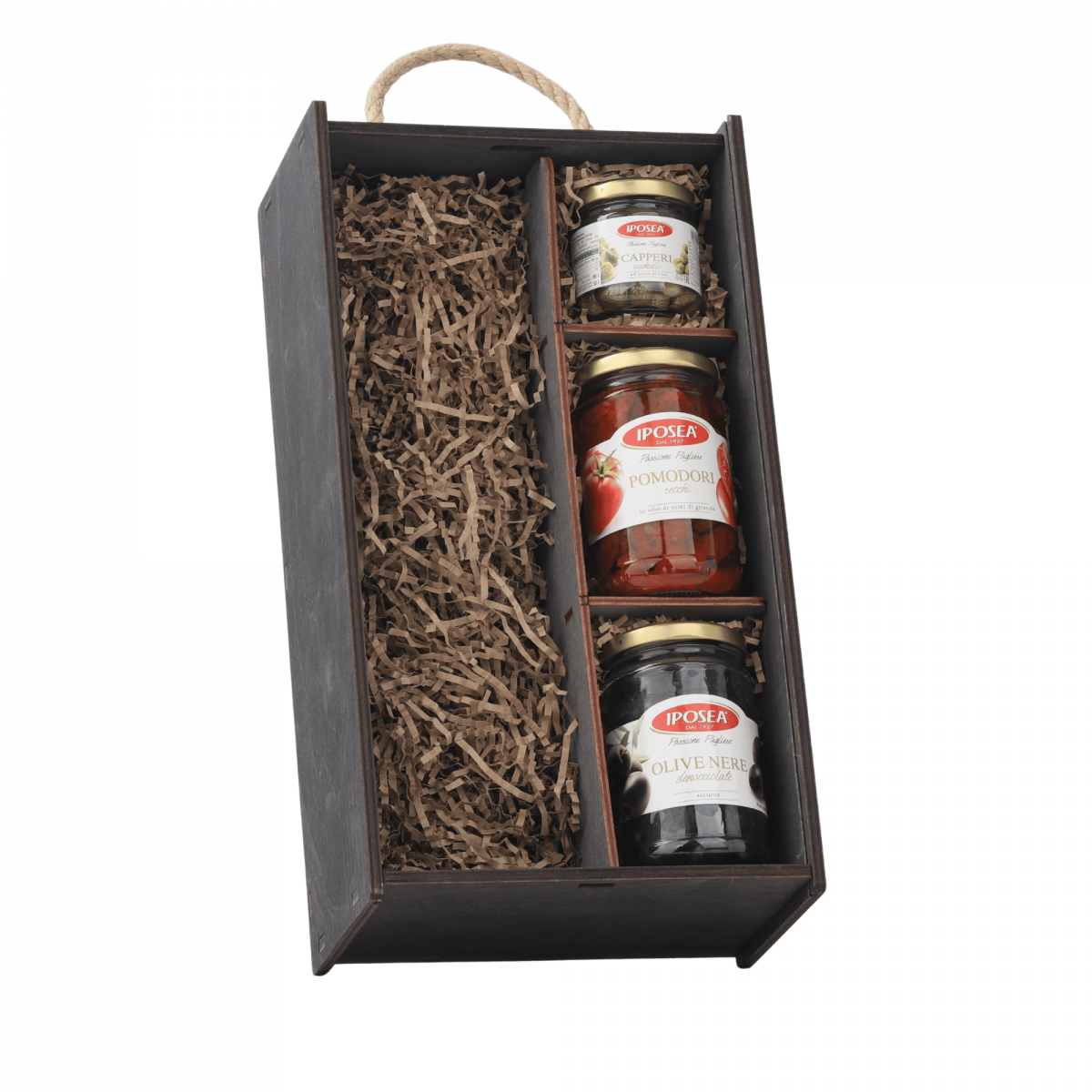Три классических вкуса в одной стильной упаковке. Внутри — пикантные каперсы Окьелло, ароматные сушёные томаты в масле и нежные маслины без косточки. Идеальное сочетание для антипасти, сырной тарелки, салатов, пасты и пиццы. Упакован в просторный деревянный пенал с перегородками, крафтовым наполнителем и декорирован бордовой атласной лентой. Элегантный подарок для ценителей средиземноморской гастрономии.