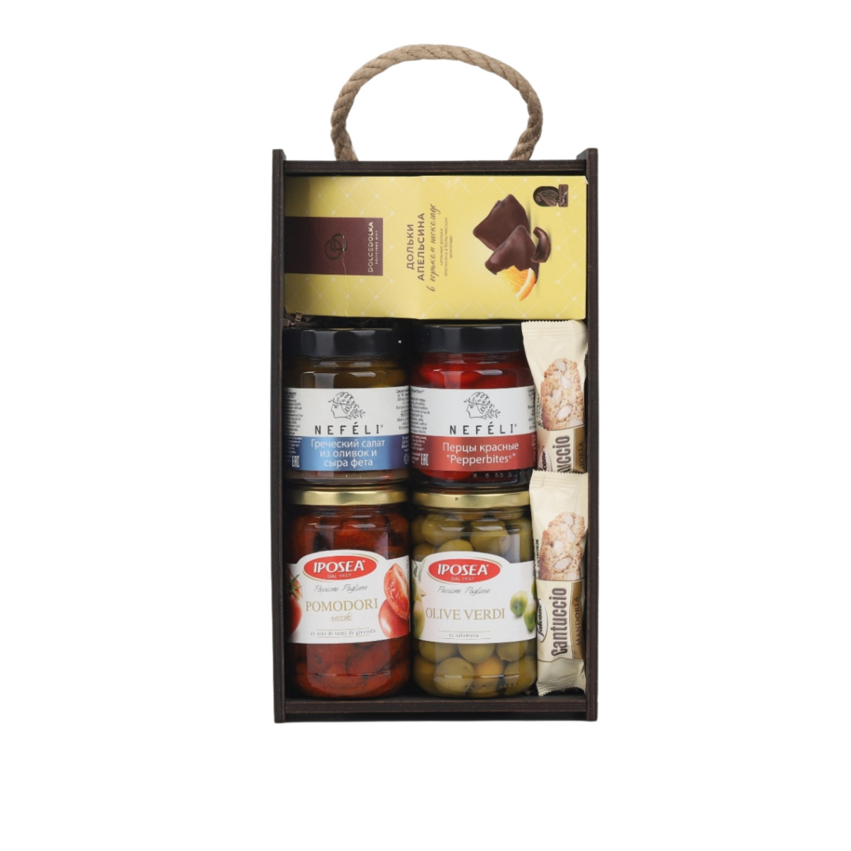 Настоящий итальянско-греческий дуэт для уютных посиделок с близкими. В наборе собраны пикантные закуски к аперитиву — сочные оливки, вяленые томаты, сладкие хрустящие перчики и оливки с нежной фетой, — а завершает трапезу хрустящее печенье кантуччи и изысканные дольки апельсина в горьком шоколаде. Упакован в стильный деревянный пенал с крафтовым наполнителем и перевязан бордовой атласной лентой. Готовый подарок для тех, кто любит начинать ужин с антипасти, а заканчивать — чашкой кофе с чем-то особенным.