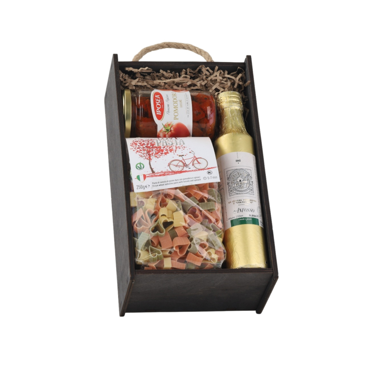Изысканный и душевный подарок для тех, кто ценит простые, но настоящие удовольствия. В основе набора — фигурные макаронные изделия «Любовь», которые одним своим видом задают тон ужину, дополненные солнцем вяленых томатов и благородным оливковым маслом. Упакован в стильный деревянный пенал с крафтовым наполнителем и перевязан бордовой лентой — готовый знак внимания без лишних хлопот.