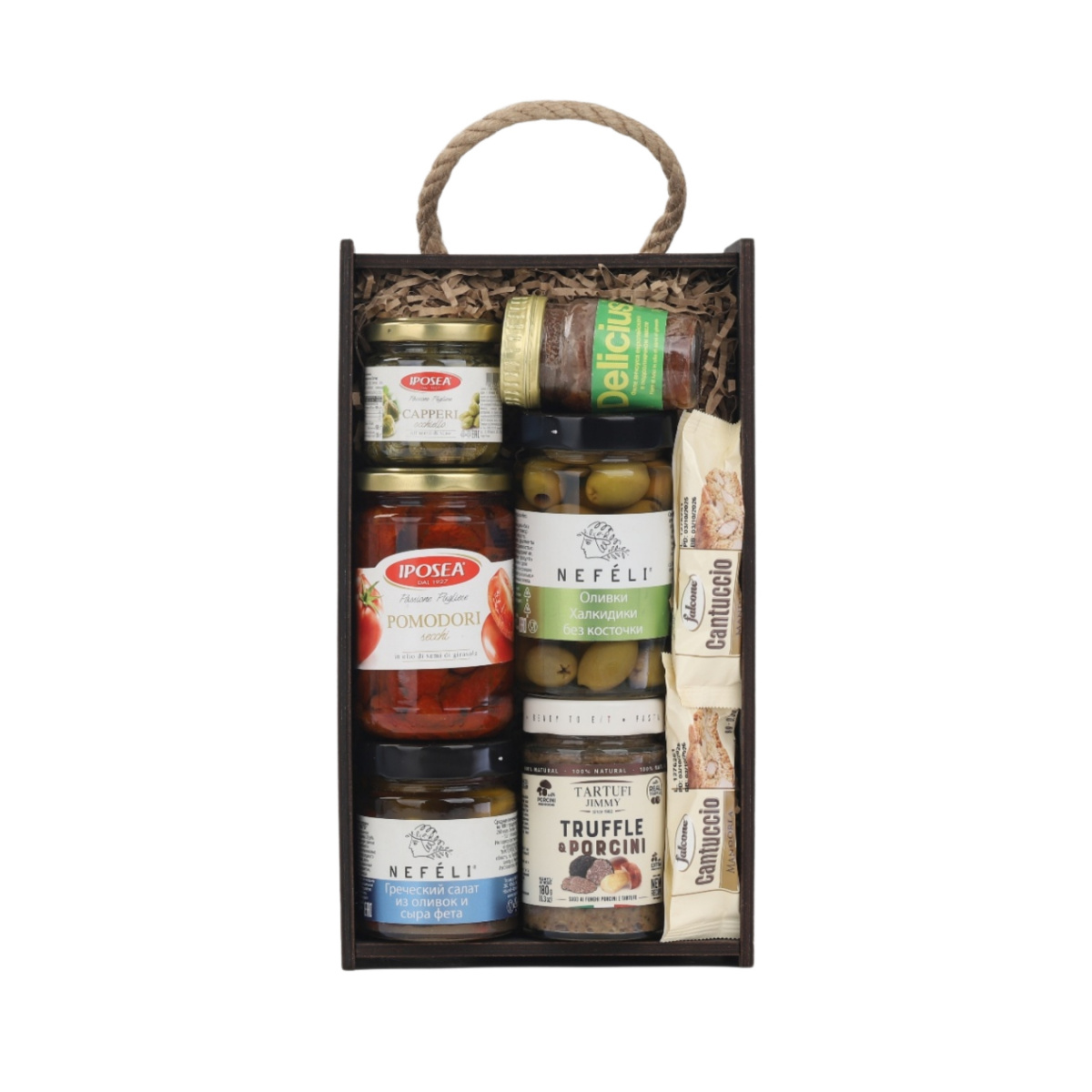 Элегантный гастрономический набор для ценителей аутентичных вкусов Италии и Греции. Внутри — пикантные каперсы, нежные анчоусы, солнечные томаты, две разновидности оливок (классические Халкидики и с фетой), а также трюфельный соус с пармиджано. Идеальное наполнение для антипасти, сырной тарелки, пасты или уютного аперитива. Упакован в стильный деревянный пенал с крафтовым наполнителем и перевязан бордовой атласной лентой — готовый подарок без лишних хлопот.