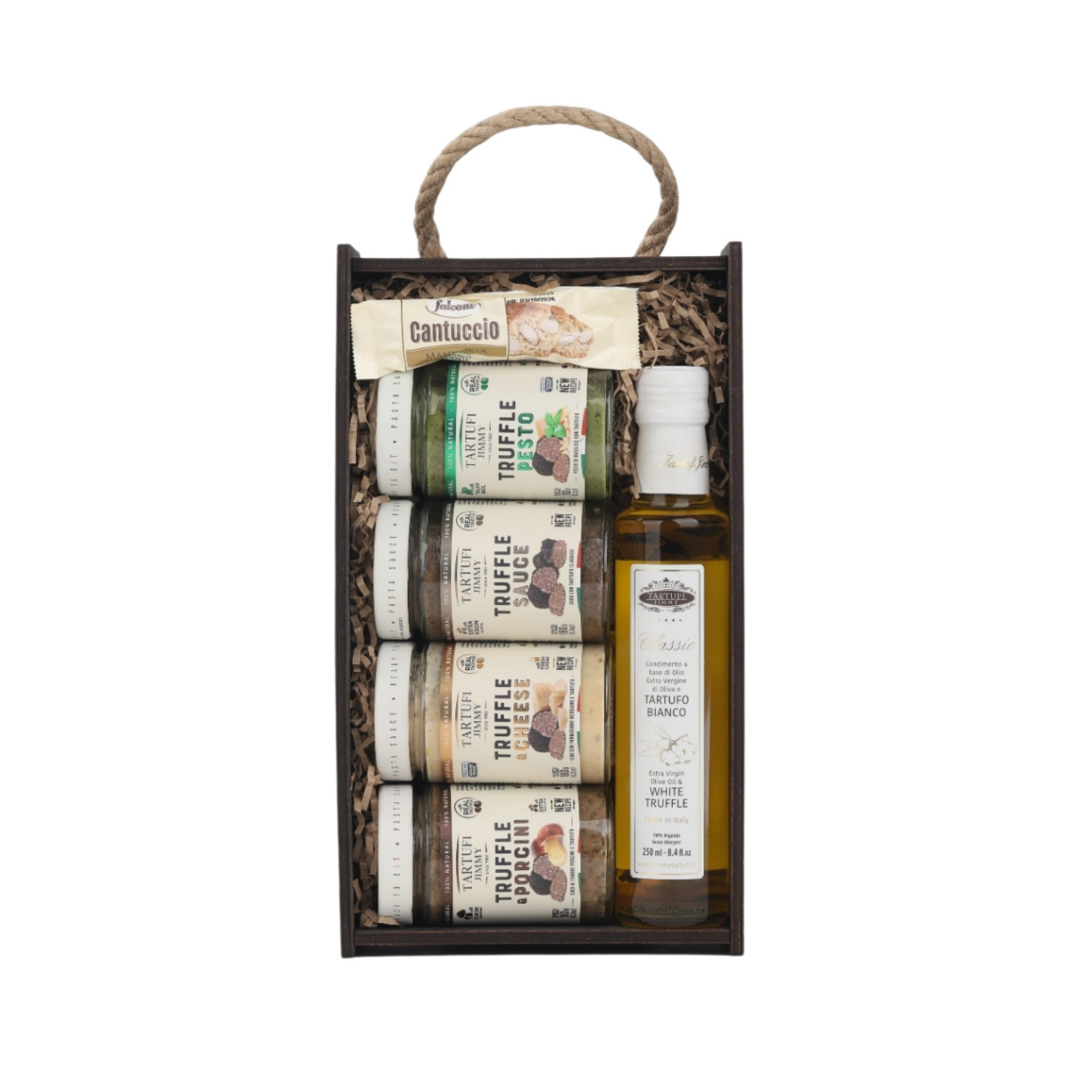 Настоящее погружение в мир изысканного вкуса. В этом наборе собрана целая коллекция трюфельных деликатесов от «Tartufi Jimmy»: от классического соуса до ароматного масла и авторского песто. Каждый элемент — это ключ к созданию ресторанного блюда на домашней кухне. Упакован в стильный деревянный пенал с крафтовым наполнителем и перевязан бордовой лентой — идеальный подарок для ценителей итальянской гастрономии.