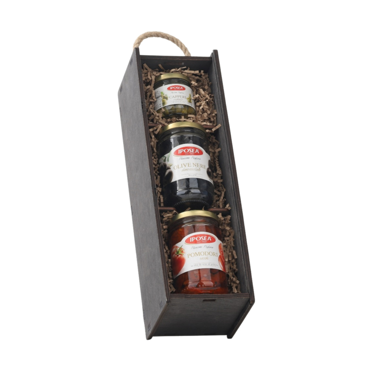 Три выразительных вкуса Средиземноморья в одном лаконичном наборе. Внутри — нежные маслины без косточки, ароматные сушёные томаты в масле и пикантные каперсы Окьелло. Идеальное сочетание для антипасти, сырной тарелки, пасты, пиццы и брускетт. Упакован в компактный деревянный пенал с крафтовым наполнителем и декорирован бордовой атласной лентой. Минималистичный и элегантный подарок для ценителей качественных закусок.
