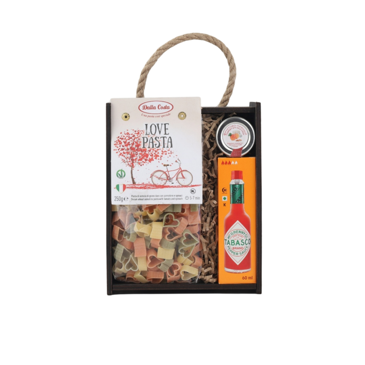 Для тех, кто любит по-настоящему яркие, пикантные вкусы и не боится экспериментов. Внутри — фигурные макароны Love pasta, легендарный соус Табаско и фруктово-пряный соус с абрикосом и миндалём. Огонь и нежность в одной коробке — идеальный дуэт для тех, кто ценит контрасты. Упакован в стильный пенал с крафтовым наполнителем — готов к вручению без лишних забот.