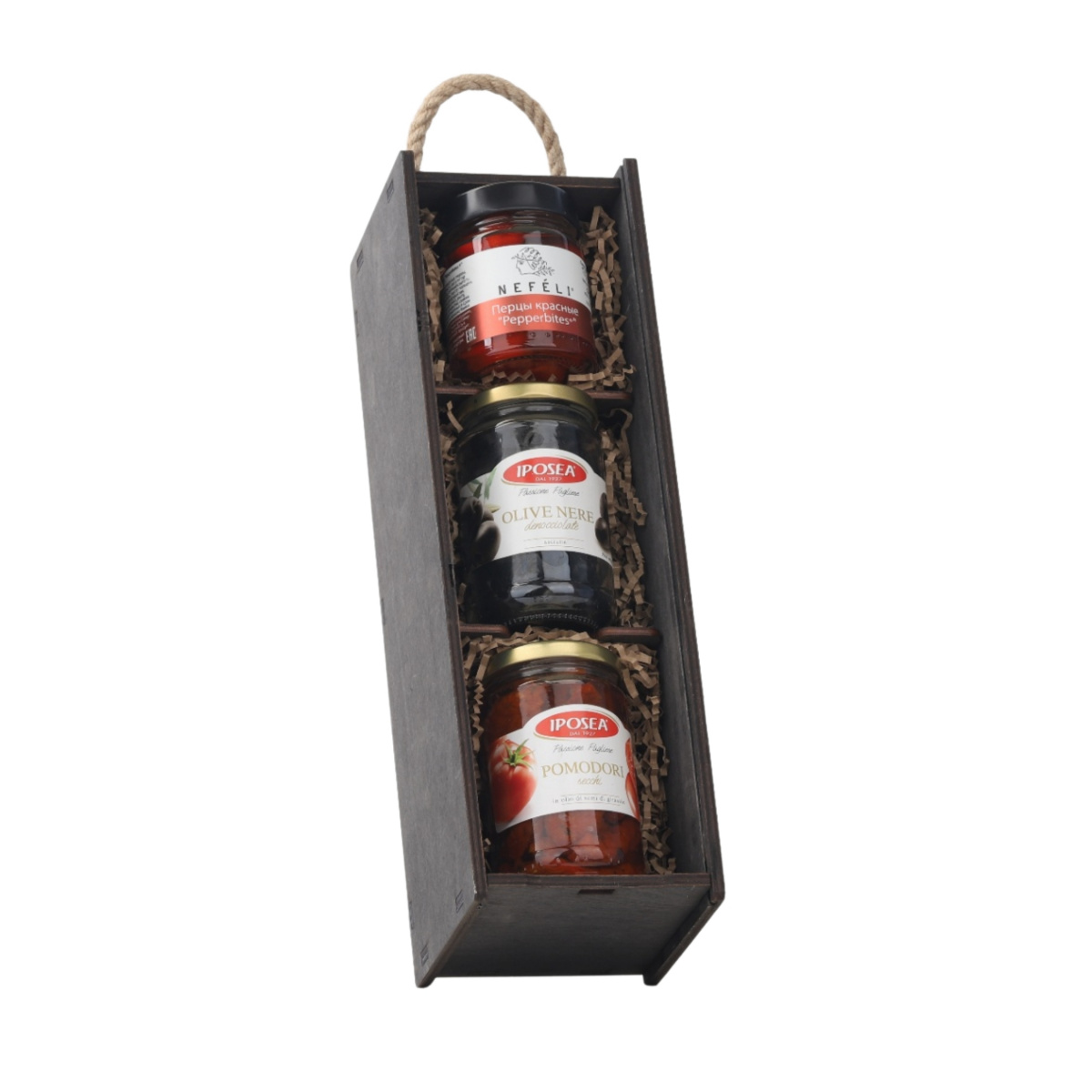 Три выразительных вкуса Средиземноморья в одном лаконичном наборе. Внутри — хрустящие греческие перцы Pepperbites, нежные маслины без косточки и ароматные сушёные томаты в масле. Идеальное сочетание для антипасти, сырной тарелки, брускетт и уютных посиделок с бокалом вина. Упакован в компактный деревянный пенал с крафтовым наполнителем и декорирован бордовой атласной лентой. Минималистичный и элегантный подарок для ценителей качественных закусок.