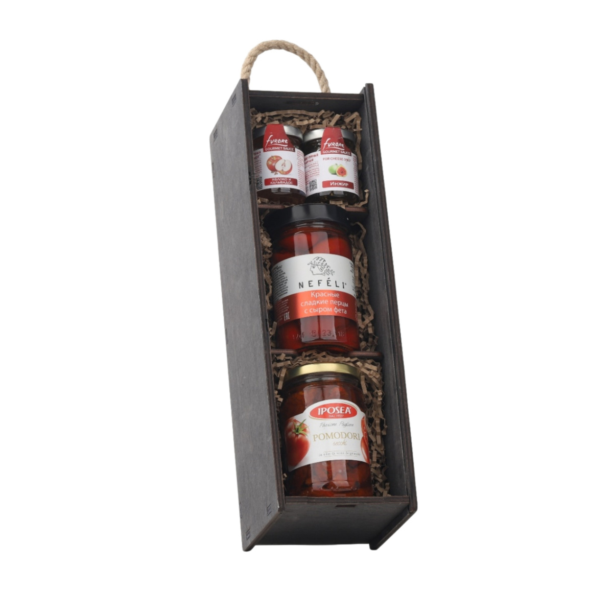 Четыре выразительных вкуса в одном лаконичном наборе. Внутри — ароматные сушёные томаты, сладкие перцы с нежной фетой и два изысканных фруктово-пряных соуса Furore (инжирный и яблоко с кальвадосом). Идеальное сочетание для антипасти, сырной тарелки, десертов и уютных посиделок с бокалом вина. Упакован в компактный деревянный пенал с крафтовым наполнителем и декорирован бордовой атласной лентой. Необычный подарок для ценителей ярких гастрономических сочетаний.