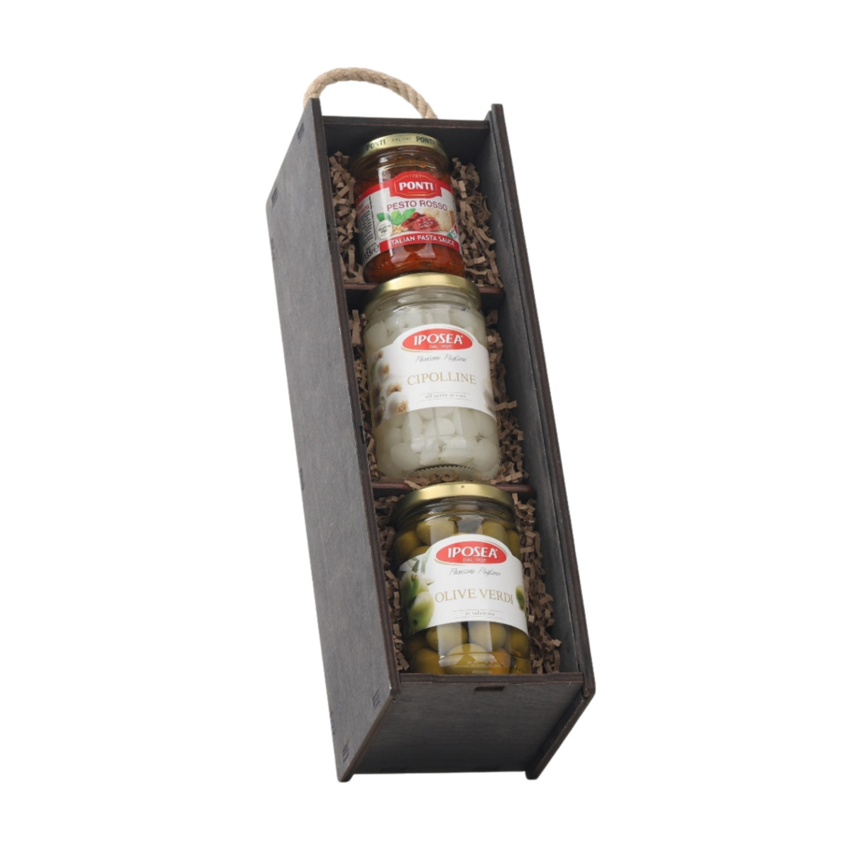 Три ярких итальянских акцента в одном лаконичном наборе. Внутри — целые оливки, маринованные луковички в уксусе и соус Песто Россо на основе подсолнечного масла. Идеальное сочетание для антипасти, сырной тарелки, пасты, пиццы и брускетт. Упакован в компактный деревянный пенал с крафтовым наполнителем и декорирован бордовой атласной лентой. Минималистичный и элегантный подарок для ценителей итальянских вкусов.